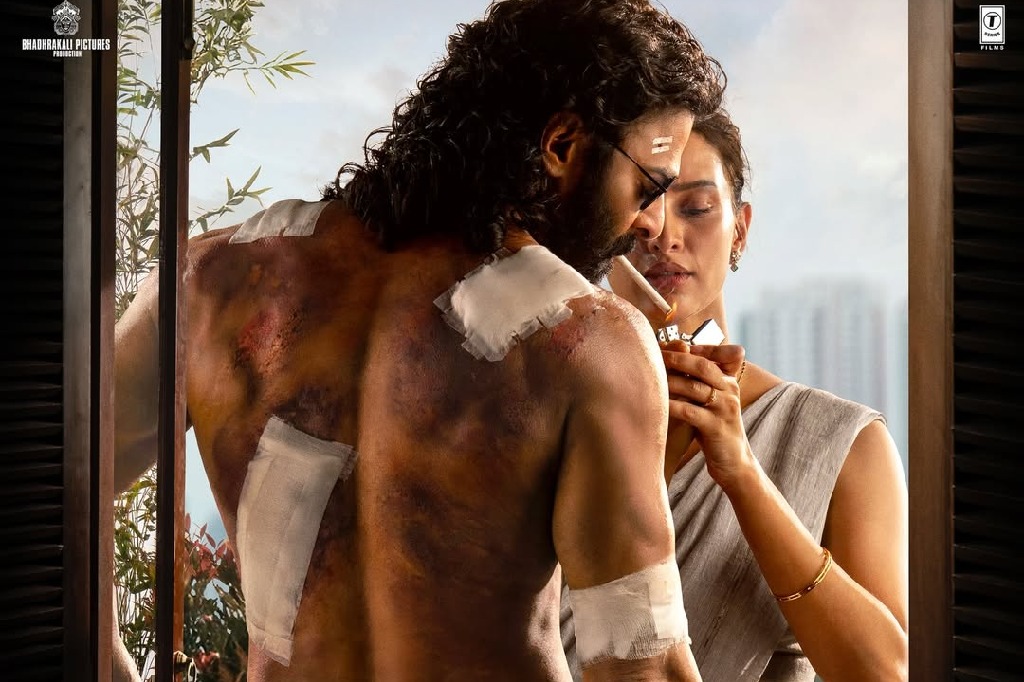 The poster features a wounded Prabhas standing by the window, while Triptii can be seen lighting his cigarette.