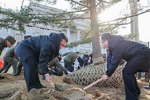 Images released by the North's state media showed Kim's wife, Ri Sol-ju, and daughter Ju-ae accompanied Kim at the event, with Ju-ae seen digging the ground along with her father in the tree planting.