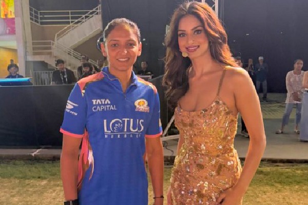 In the image, the former beauty queen looks radiant in a golden ensemble as she poses alongside Harmanpreet, who cuts a confident figure in the Mumbai Indians jersey, embodying the spirit of a champion.