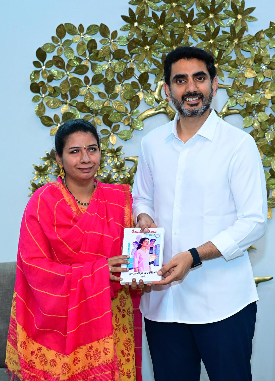Amaravati: Andhra Pradesh Minister for Education and IT, Nara Lokesh, unveiled a new novel titled "Cheyi Veedani Chelimi" at his residence in Undavalli. The book was penned by Chinthakrindi Saijyothi, a visually impaired writer from Mangalagiri, who has overcome physical challenges to pursue her passion for literature using modern technology.