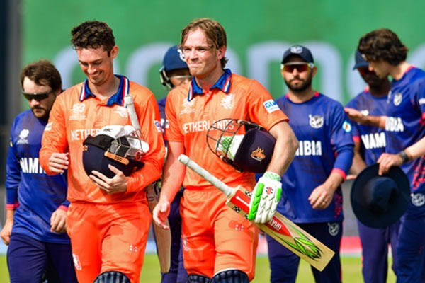 Brief Scores: Namibia 156/8 in 20 overs (Jan Nicol Loftie-Eaton 42, Jan Frylinck 30; Logan van Beek 2-13, Bas de Leede 2-20) lost to Netherlands 159/3 in 18 overs (Bas de Leede 72 not out, Colin Ackermann 32; Bernard Scholtz 1-27, Ruben Trumpelmann 1-30) by seven wickets