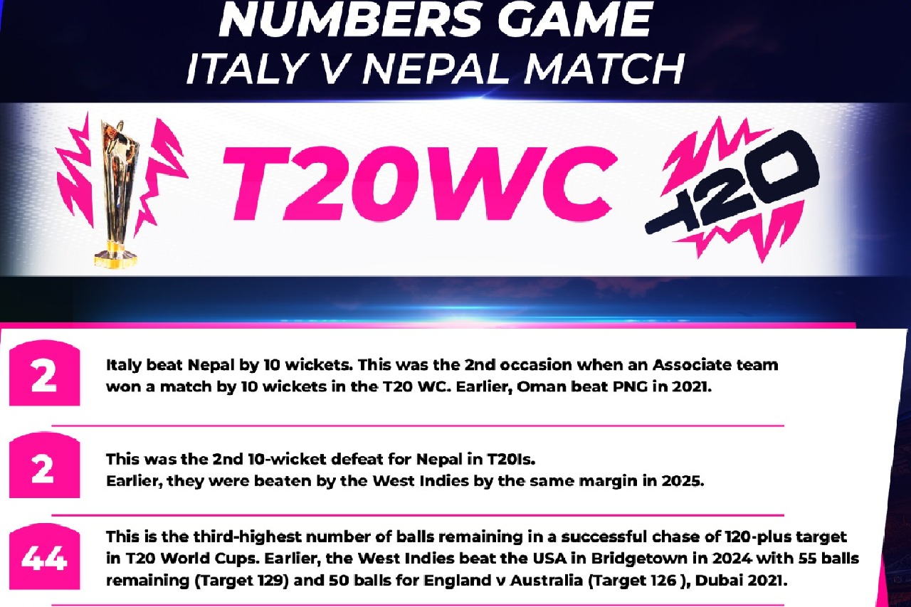 Mumbai, Feb 12 : Debutant Italy etched their name in the history books after they registered an emphatic 10-wicket victory against Nepal in their second match of the T20 World Cup 2026, played at the iconic Wankhede Stadium in Mumbai on Thursday, becoming only the second associate team after Oman to register a ten-wicket victory in T20 World Cup history.