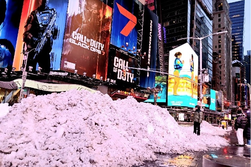 Many tourists flocked to Times Square amid the cleared snow piled into mini-mountains by emergency workers.