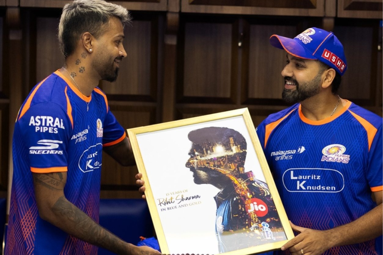 New Delhi, April 11 : Mumbai Indians captain Hardik Pandya congratulated the team’s former skipper Rohit Sharma on completing 15 years with the franchise and delivered a heartfelt speech in the dressing room, expressing his gratitude to the veteran and thanking him for inspiring several MI players.