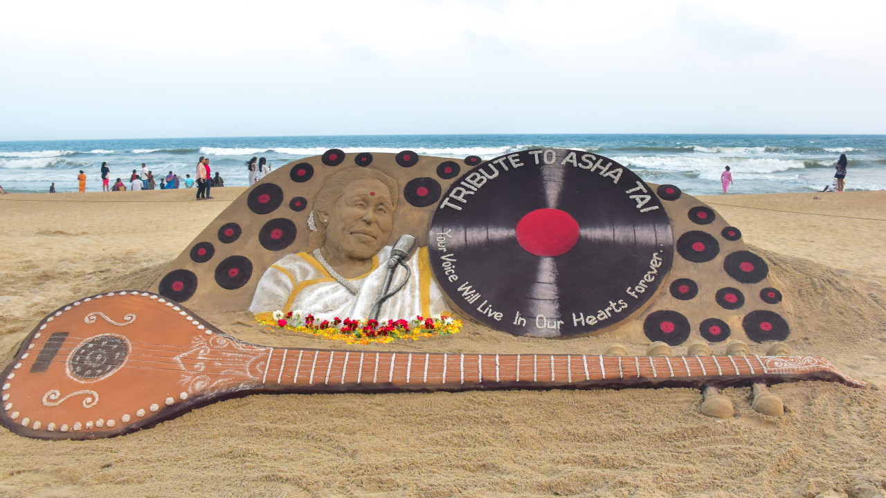Bhubaneswar, April 12 : Renowned sand artist and Padma awardee Sudarsan Pattnaik on Sunday paid a heartfelt tribute to legendary singer Asha Bhosle with a magnificent sand sculpture at Puri Beach in Odisha.