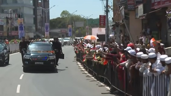 Large numbers of people gathered along the sides of the road, chanting phrases such as "Modiji aapka swagat hai," "Bharat Mata Ki Jai," and "Modi, Modi," while waving the Tricolour and the BJP flag.