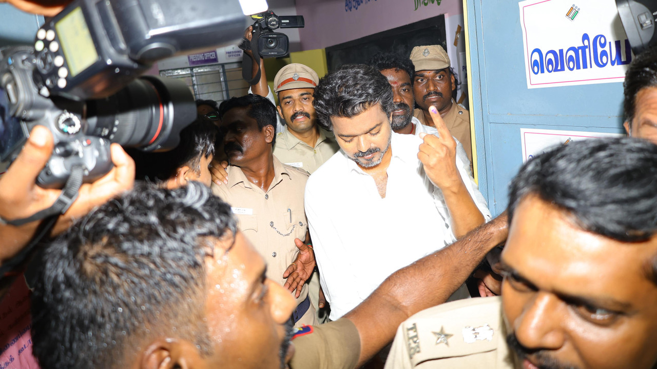 Chennai, April 23 : Actor and political party leader Vijay, who exercised his right to vote at the Neelankarai polling station in Chennai, on Thursday appealed to the Election Commission to direct state transport authorities and district election officers to immediately press additional government buses into service exclusively for ferrying stranded voters from bus terminals to polling stations.