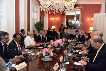 Washington, June 7: Prime Minister Narendra Modi, who is in the US on the fourth leg of his five-nation tour, met the heads of US think tanks here. "Probing the minds of those who shape foreign policy. PM @narendramodi at an interaction with think tanks in Washington," Ministry of External Affairs Spokesperson Vikas Swarup tweeted on Tuesday along with a picture of the meeting. Earlier, Modi attended an event in which Indian idols lying in the US have been returned to India. The PMO tweeted: "After history & culture, it's current & strategic affairs. Think tanks meet PM, share perspective on various issues."