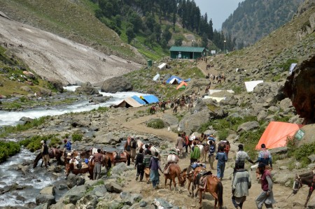 Jammu, July 5: Since its beginning on July 2, 40,000 pilgrims have performed the Amarnath Yatra as another batch of 1,924 pilgrims left Jammu for the Valley on Tuesday. An official of the Shri Amarnathji Shrine Board (SASB) told IANS, "40,000 Yatris have performed the Amarnath Yatra during the last three days." "Escorted by security forces, 1,924 pilgrims left the Bhagwati Nagar Yatri Niwas at 5.15 a.m. in 53 vehicles," a senior police officer said. In its daily weather bulletin for the Yatra, the MET office has forecast light rain/thundershowers in the afternoon -- both on the Baltal-Cave Shrine and Pahalgam-Cave Shrine sectors. Weather is expected to remain partly cloudy on Jammu-Srinagar national highway on Tuesday. The highway is the only surface link for the pilgrims to reach the Cave Shrine in Kashmir Himalayas situated at 3,888 metres above the sea level. The Cave Shrine houses an ice stalagmite structure that wanes and waxes with the phases of the moon. Called the 'Holy Lingam', the devotees believe the ice stalagmite structure symbolises mythical powers of lord Shiva. Yatris trek up the 14-Kilometre long route from the north Kashmir Baltal base camp to reach the Cave Shrine. The distance from the south Kashmir Nunwan (Pahalgam) base camp to the Shrine is 46 kilometres. The halting points from Pahalgam to the Cave Shrine include Chandanwari, Sheshnag, Pissu Top and Panchtarni. A three-tier security cover manned by the army, the ITBP, the CRPF and the state police has been put in place to provide security to the pilgrims. Extraordinary security arrangements have been made for this year's Yatra because of guerrilla attacks on the security forces in the Valley especially on the Jammu-Srinagar highway. The Yatra will conclude on August 17 coinciding with Shravan Purnima and Raksha Bandhan festivals.