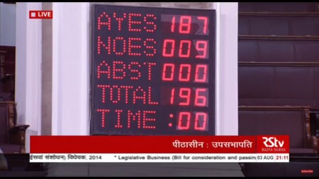 When the voting on the first amendment to the GST Bill was called, it showed 197 ayes and no nos. The voting was taken after the AIADMK members walked out of the House.