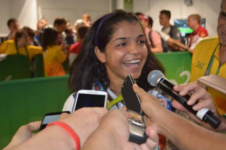 New Delhi, Aug 18: Prime Minister Narendra Modi on Thursday congratulated wrestler Sakshi Malik who clinched bronze on Wednesday to give India its first medal at the on going Olympics in Brazil's Rio de Janeiro. "Sakshi Malik creates history! Congratulations to her for the Bronze. The entire nation is rejoicing," Modi tweeted. Sakshi, 23, brought an end to India's long medal wait when every hopeful had failed one by one. In another tweet, the prime minister said: "On this very auspicious day of Raksha Bandhan, Sakshi Malik, a daughter of India, wins Bronze & makes all of us very proud." Sakshi clinched the bronze in the Women's Freestyle 58kg category with a spirited comeback victory over Aisuluu Tynybekova of Kyrgyzstan.