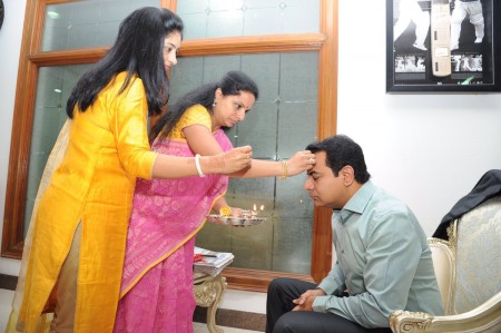 Hyderabad, Aug.18: On the occasion of Rakhi Festival TRS Parliamentary Member K Kavitha today tied a Rakhi to her brother and Minister KT Rama Rao today. As part of exchanging pleasantries, Kavitha offered sweets to him. Brahma Kumaris also came to meet the minister and tied rakhis to mark the festival. The stated that KTR is standing like a brother to the people of Telangana. They hoped that every program being taken up the minister would be a success. On the occasion, Cinematography Minister T Srinivas Yadav celebrated the Rakhi festival. Women from his Sanath Nagar constituency and other places of the city came to the minister’s house. They tied rakhis to Srinivas Yadav and exchanged pleasantries. While across 10 Telangana districts the Rakhi festival was celebrated amid enthusiasm and gaiety. Sisters tied rakhis to their brothers to mark the occasion and exchanged sweets and pleasantries. Raksha Bandhan is noted for rejuvenating the relationship between families as it reflects the culture and tradition.