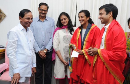 The star shuttler and her coach called on the Chief Minister on their return from Rio Olympics. Accompanied by her parents, Sindhu showed her silver medal to Rao, who was all praise for her historic achievement.