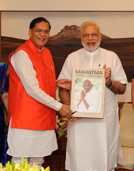 New Delhi, Oct 2: Prime Minister Narendra Modi on Sunday was presented with the first copy of a book on Mahatma Gandhi, containing coloured pictures reflecting various phases of his life.