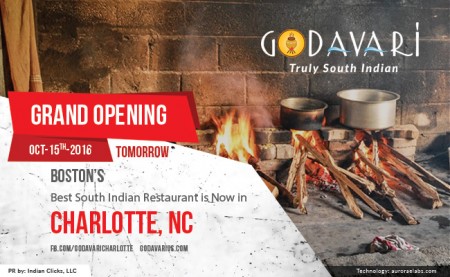 USA, North Carolina, Oct 14th 2016 (Press Note): Godavari, South Indian restaurant giant flows into North Charlotte, to dish out themed cuisine, strategically located in North Charlotte.