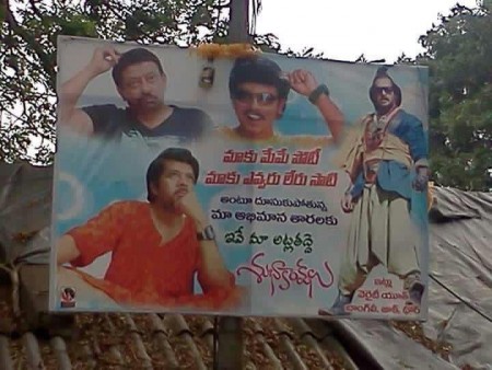 We often see fans going crazy over their beloved stars. Especially in Banners, they show their creativity and love towards them. Yet another interesting poster generating laughs among the audience. Today, Hrudaya Kaleyam director Sai Rajesh shared one of the pics on his facebook account. This pic is receiving a superb response from the audience. Coming to this banner, It has Sampoornesh Babu, Ram Gopal Varma, Upendra and Posani Krishna Murali on it, where it was written that 'Maaku Meme Poti Maaku Evarru Leru Saati Antu Doosukupotunna maa abhimana taralaku eve maa Atlataddi Subakanshalu'. This is really hilarious Atlataddi Subakanshalu which you may not see before like this. Actually, we all know that these four always try to be different and have their typical own style, which is why this banner was so special and wishes are even more surprising.