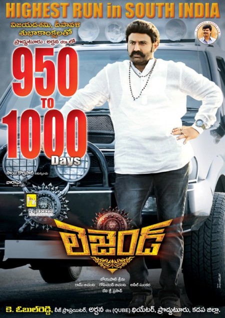 Nandamuri Balakrishna's Legend directed by Boyapati Sreenu creating history in Telugu industry. It now entered into 950+ days run at the box office in one of the theatres. A poster claiming 950-1000 days run was released today.