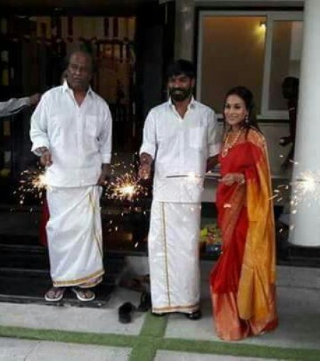 He celebrated Diwali with his family members. Coming to the pic, we can see that he is lighting crackers along with her Daughter Aishwarya and Son-in-law Dhanush. All three are seen in Traditional attire which suits well for Festival mood. This picture made superstar fans happy as a few days ago it was reported that he went to the USA for medical related issues which worried the fans on Rajinikanth's health but he was back to India before Diwali and celebrating Diwali now with his family.