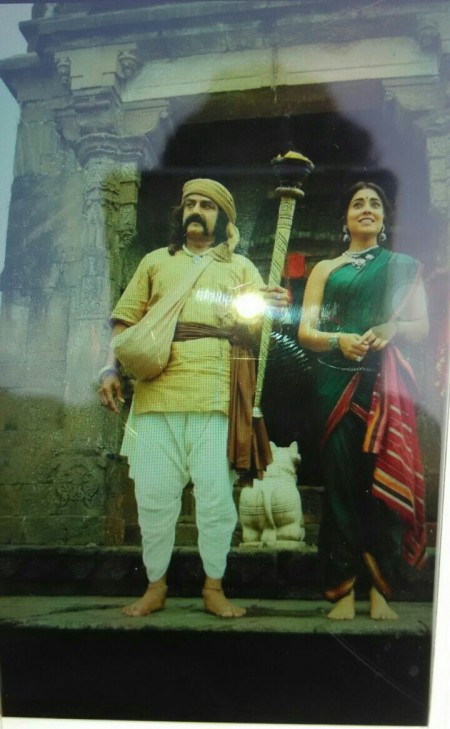 Coming to the pic, Both Balakrishna and Shriya Saran costumes and looks surprised everyone. Balakrishna is seen in a Powerful look seriously, on the other hand, Shriya has an innocent smile with a surprise on her face. Overall, it seems like Balakrishna will be seen in two different shades in the movie as until now we saw two looks wherein one look he wears rich costumes and looks royal and another one is this getup.
