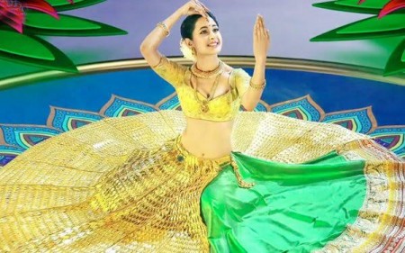 However, she grabbed everyone's attention with just this 14.5 Gold Lehenga dress. Thus Raghavendra Rao yet again was shown his creativity in this Rich costume.