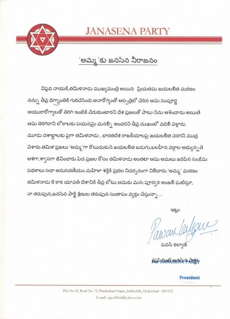 Today Jana Sena party released a press note on behalf of Pawan Kalyan, in which he expressed his deepest condolences over the sudden demise of 'Amma' Jayalalithaa.
