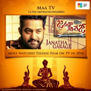 Young Tiger Jr.NTR's 'Janatha Garage' remained as the highest collected movie in 2016 by minting close to Rs 82 crores. The film now also remained as the super hit on TV. As per the BARC reports, Janatha Garage is the most watched Telugu movie in 2016 with 13,924 impressions. MAA TV grabbed the satellite rights and remained as profitable one for them.