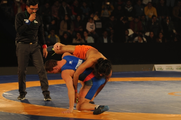 New Delhi, Jan 18 : Yoga guru Baba Ramdev displayed his wrestling skills as he went head-to-head with 2008 Olympic silver medalist Andriy Stadnik in a promotional bout of the Patanjali Powervita Pro Wrestling League (PWL) here on Wednesday.