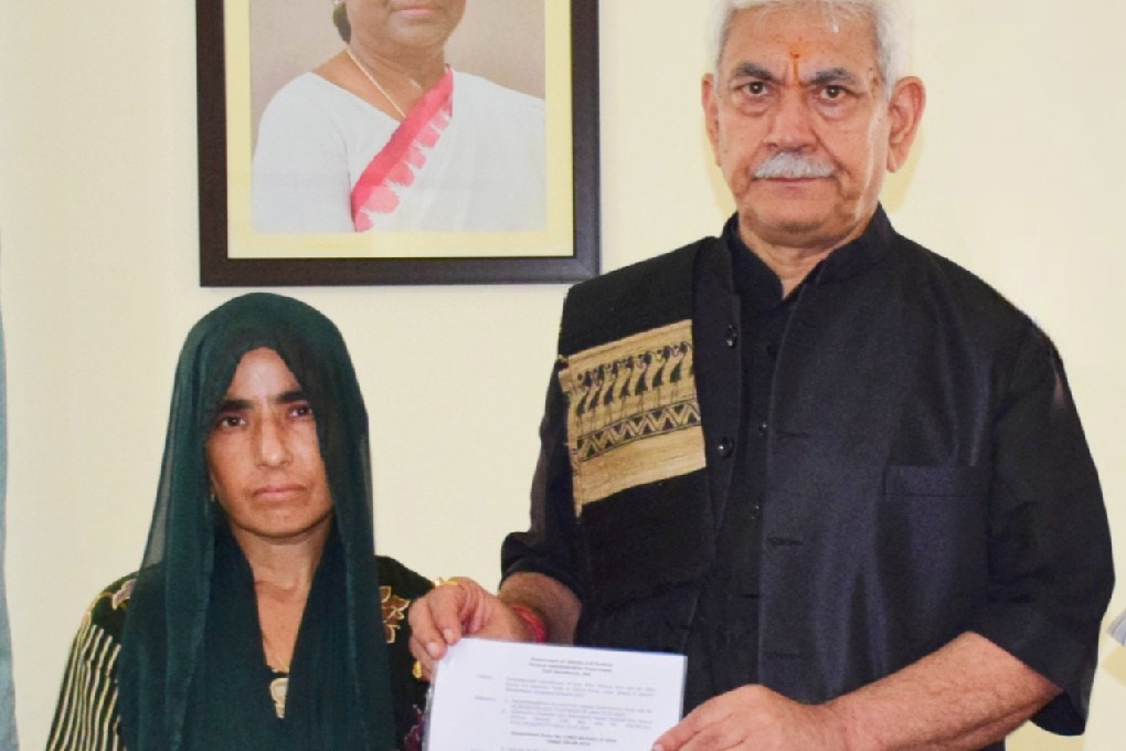 Jammu, Aug 10 : Jammu & Kashmir Lieutenant Governor Manoj Sinha, on Saturday, handed over the appointment letter to Renu Sharma, widow of Vijay Kumar, who was killed in Reasi Terror attack.