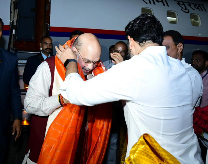 Union Home Minister Amit Shah arrived in Andhra Pradesh as part of his official visit. He landed at Gannavaram Airport at 8:30 PM, where Andhra Pradesh Minister Nara Lokesh extended a warm welcome.