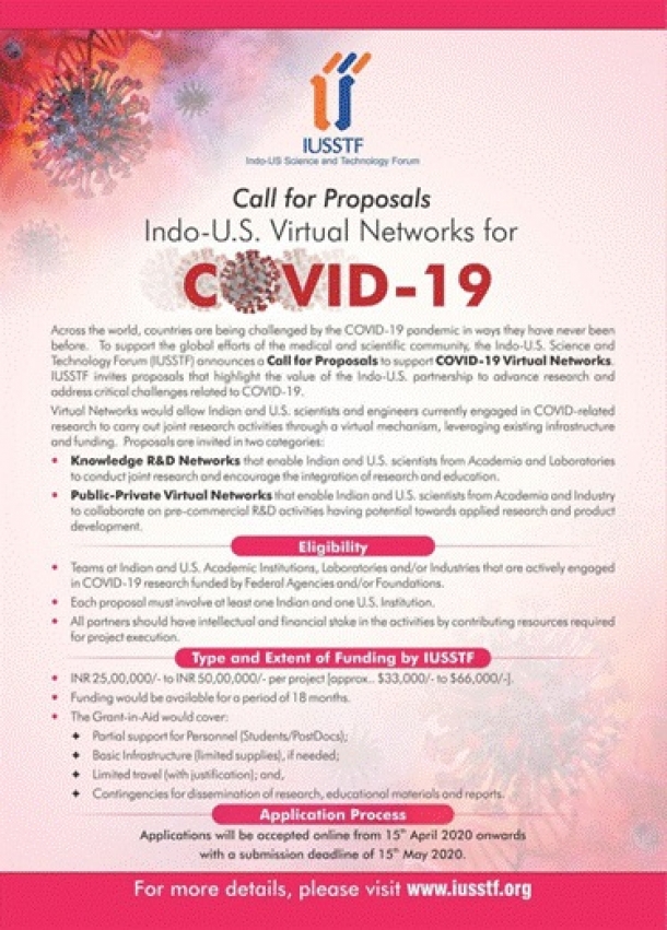 The Indo-U.S. Science and Technology Forum (IUSSTF), has invited Proposals for ‘COVID-19 Indo-U.S. Virtual Networks’ that would allow Indian and U.S. scientists and engineers currently engaged in COVID-related research to carry out joint research activities through a virtual mechanism, leveraging existing infrastructure and funding. Proposals that convincingly demonstrate the benefits and value of the Indo-U.S. partnership to advance research and address critical challenges related to COVID-19 are encouraged.