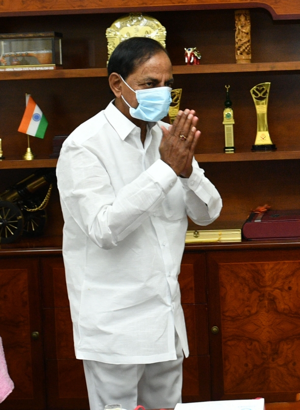 మాస్క్ ధరించడం, సానిటైజర్ ఉపయోగించడం వంటి ముందు జాగ్రత్త చర్యలు తీసుకుంటున్న తెలంగాణ సీఎం కేసీఆర్