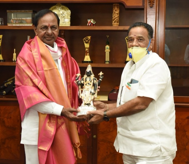 వెంకటేశ్వర స్వామి ప్రతిమను, తిరుపతి ప్రసాదాన్ని సీఎం కేసీఆర్ కు అందించిన టీటీడీ కమిటి సభ్యుడు