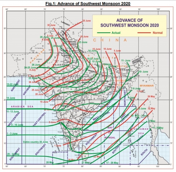 - The Southwest Monsoon has further advanced into the remaining parts of Rajasthan, Haryana, and Punjab and thus it has covered the entire country today, the 26th June 2020(Fig. 1).