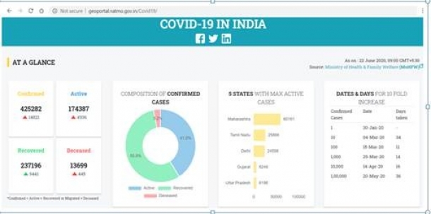 National Atlas and Thematic Mapping Organization (NATMO) functioning as a subordinate department under the Department of Science & Technology, Ministry of Science & Technology, Government of India published the 4th updated version of COVID-19 Dashboard on its official Portal at http://geoportal.natmo.gov.in/Covid19/ on 19th June 2020.