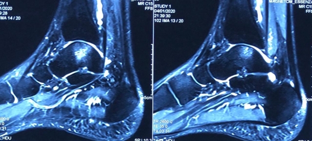 He was thoroughly examined with an MRI scan of ankle, which showed a defect in cartilage of around 18 mm x 20 mm over the left talar dome in the weight bearing axis. This was the real reason for his pain. He couldn't remember the exact reason for the injury too. Later he doubted about the ankle injury which he met with long ago.
