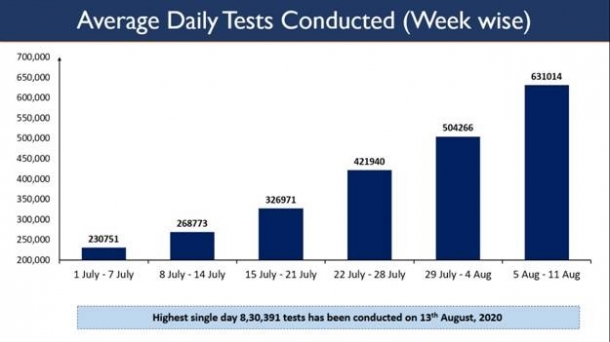 The strong resolve and determination of Union and State/UT Governments to follow aggressive testing as the first important step in the early detection and isolation of COVID-19 positive cases has resulted in India rapidly increasing the number of tests done per day. The week-wise average daily tests conducted saw a sharp increase from around 2.3 lakh in the first week of July 2020 to more than 6.3 lakh in the current week.