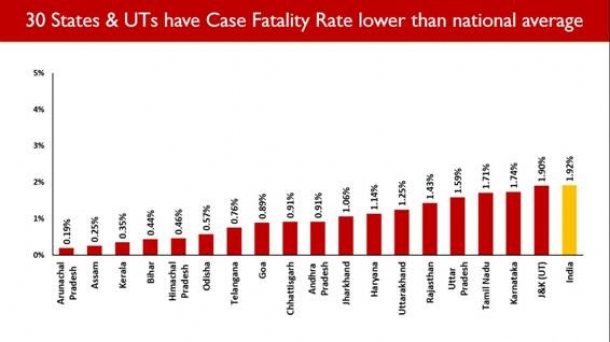 Continuous increase in average daily recoveries has led to India's Recovery Rate touching 73.18% and a low Case Fatality Rate (1.92%). As a result of collaborative and focussed efforts by the Centre and State/UT governments built on effective implementation of the TEST, TRACK, TREAT strategy of the Union Government, 30 States/UTs are reporting lower CFR than the national average. Aggressive TESTING leads to early identification and isolation of  positive cases. This coupled with efficient clinical treatment has ensured a law Fatality Rate down.