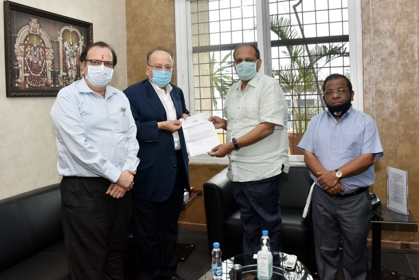 K.Muralidharan and Mallikarjuna Goud, United Breweries Limited are seen handing over a cheque for Rs. 25/- lakhs to Somesh Kumar, Chief Secretary at BRKR Bhavan today towards the CM Relief fund.
