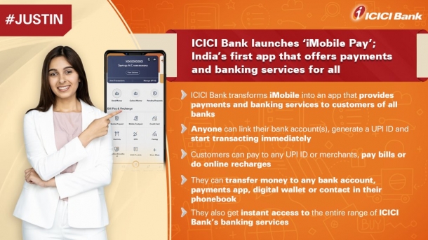 Mumbai: ICICI Bank today announced that it has transformed its state-of-the-art mobile banking app, iMobile, into an app that offers payments and banking services to customers of any bank. Called ‘iMobile Pay’, the app offers a unique combination of facilities of a payment app-- such as enabling customers to pay to any UPI (Unified Payments Interface) ID or merchants, pay bills and do online recharges among others-- with instant banking services namely savings account, investments, loans, credit cards, gift cards, travel cards and much more. The users of ‘iMobile Pay’ can also transfer money to any bank account, payment apps, and digital wallets.