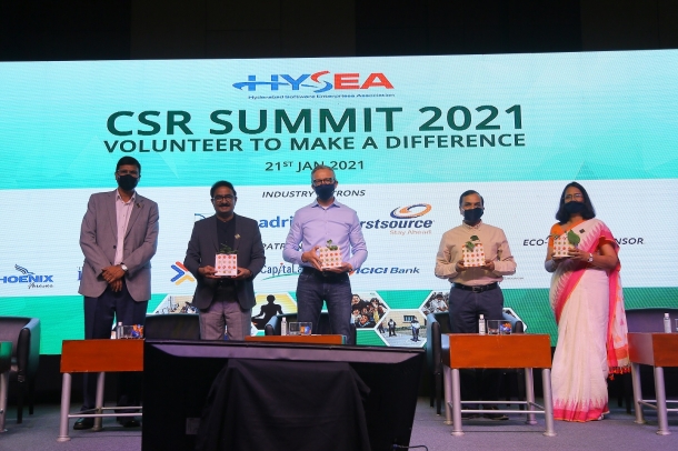 Earlier Mr. Bharani K Aroll, President, HYSEA welcomed the participants to the summit and said, “HYSEA has been committed to CSR for more than a decade and half now, with our focus primarily on Education and Environment. Our education initiative DDI (Disruptive Digital Intervention) has now reached more than 12000 students in 30 schools statewide. HYSEA has had tree plantation drives in HITEC City and Gachibowli regularly since 2009 and has been an active partner for Haritha Haram”. He also said,” This year we have added one more important focus area, ‘Health and Well-being’, where our CSR Forum volunteers will focus on projects related to livelihood creation, poverty alleviation, housing, women empowerment, child development, and infrastructure creation”. HYSEA he said, in collaboration with other Industry bodies in Hyderabad channelized approx. 100 crores from the IT industry through a campaign called IT4TS towards procurement of medical infrastructure for CoVID relief activities”.
