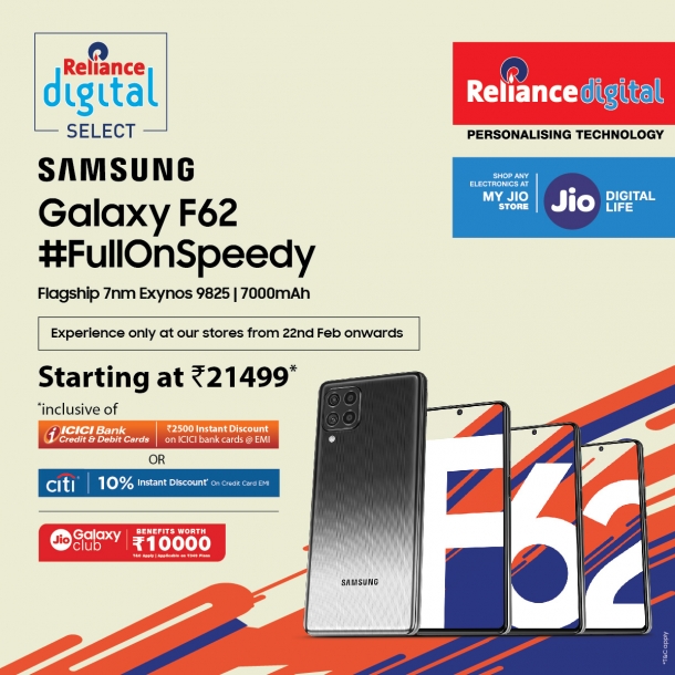 Speaking on the partnership, Brian Bade, Chief Executive - Reliance Digital said, “We are very excited to be the only offline partners bringing the Samsung Galaxy F62 to customers across India. Our large network of Reliance Digital & My Jio stores will allow customers across the country to be the first to experience and buy the phone. We’re sure that our customers will be thrilled by the performance of this phone, especially at a price point that makes it accessible to many.”