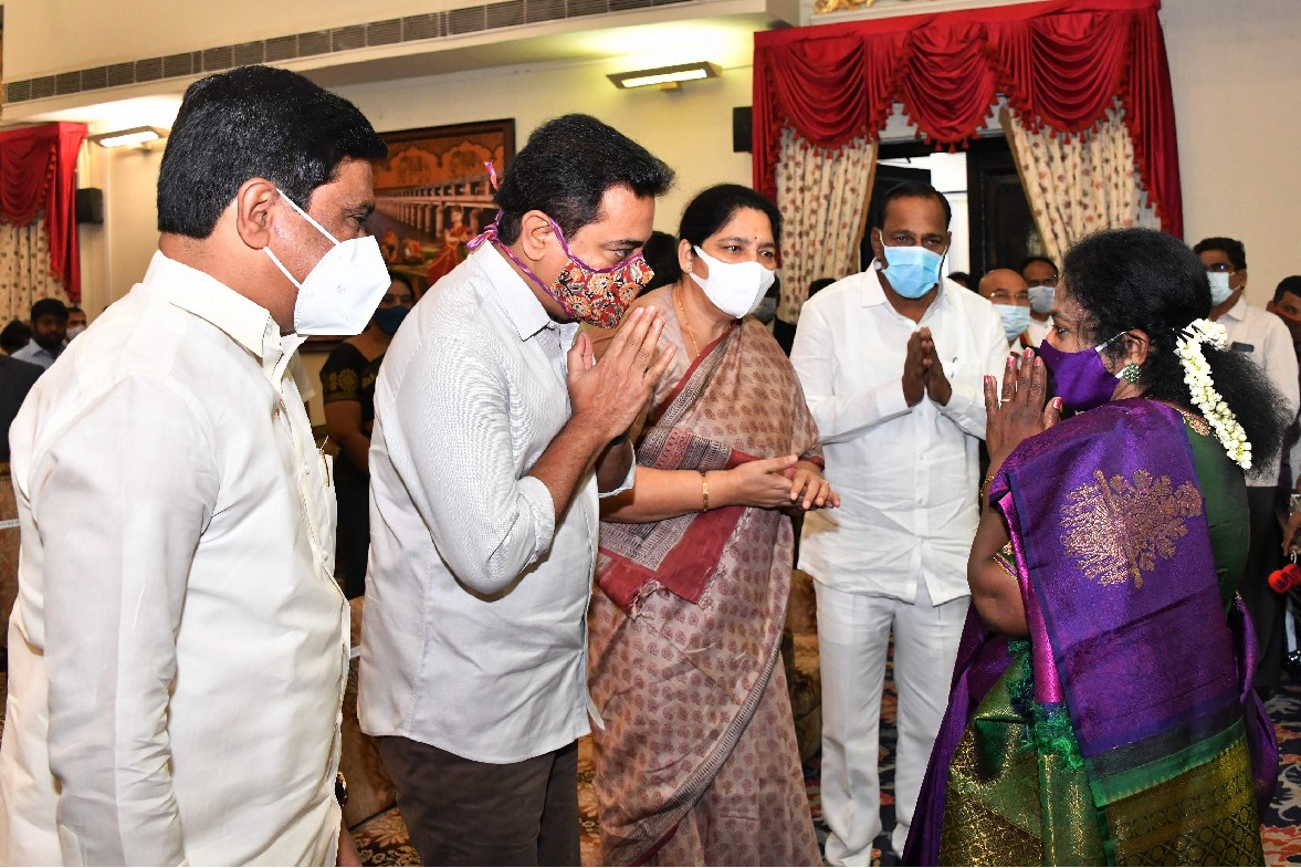 Telangana Legislative Council Chairman V. Bhupal Reddy, Ministers K T Rama Rao, V. Prashanth Reddy, Satyavathi Rathod, V. Srinivas Goud, and Ch. Malla Reddy, were among others who were present on the occasion at the Raj Bhavan.