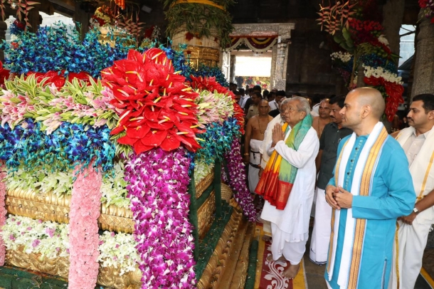 ఆంధ్రప్రదేశ్ రాష్ట్ర గవర్నర్ బిశ్వ భూషన్ హరి చందన్ గురువారం తిరుమల శ్రీవారిని దర్శించుకున్నారు. మధ్యాహ్నం శ్రీవారి దర్శనార్ధం తిరుమల చేరుకున్న ఆయన తొలుత పద్మావతి అతిధి గృహానికి విచ్చేశారు. అనంతరం గౌరవ గవర్నర్ హరి చందన్ మహాద్వారం ద్వారా ఆలయంలోకి వెళ్లి శ్రీవారిని దర్శించుకున్నారు. స్వామివారి దర్శనం అనంతరం రాష్ట్ర గవర్నర్ కు రంగ నాయక మండపం లో అర్చక స్వాములు స్వామివారి తీర్థ ప్రసాదాలను అందచేసి ఆశీర్వచనం అందించారు.