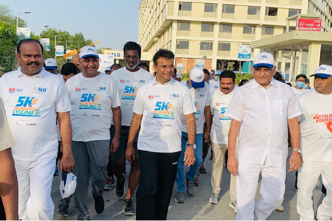 Hyderabad, May 29th, 2022: SLG Hospitals, one of the leading healthcare facilities in the city, today commemorated ‘World No Tobacco Day 2022’ with a ‘5K Running & Cycling’ event. This event was organized to raise awareness on the ill and deadly effects of tobacco on the health of people; and was inaugurated by Shri. K P Vivekananda, MLA, Quthbullapur Assembly Constituency, along with Mr. Dandu Siva Rama Raju, CMD, SLG Hospitals. Organized in association with Happy Hyderabad Cycling Club and Hyderabad Cycling Group, the event started at 6 a.m. from the SLG Hospitals campus and participants went around Nizampet area, to spread awareness against tobacco consumption.