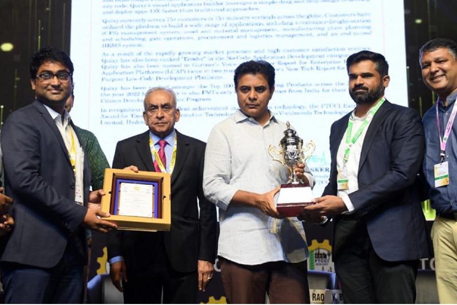 Hyderabad, India, 5th July 2022 – Quixy (VividMinds Technologies Pvt. Ltd), a leading No-Code Workflow Automation and Enterprise Application Development platform, was awarded the coveted Excellence in Information Technology Award 2022 from FTCCI (Federation of Telangana Chambers of Commerce and Industry). Quixy which had been recognized for its innovation and success in the Information Technology ecosystem, was handed the award by Mr. K.T. Rama Rao, Minister for Industries & Commerce, and Information Technology, Government of Telangana and Mr. Jayesh Ranjan, Principal Secretary, Industries & Commerce and Information Technology (IT), Telangana government, in the presence of Mr. Bhaskar Reddy, President, FTCCI.