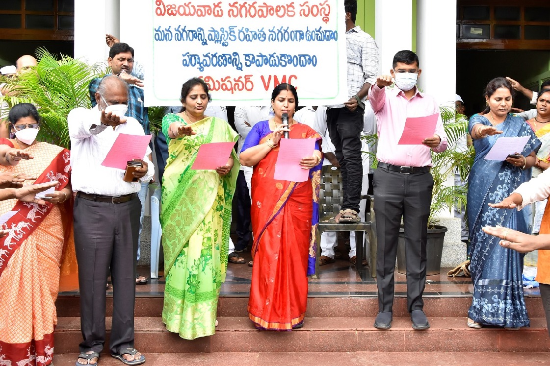 - నగరపాలక సంస్థ సిబ్బందితో కలసి ప్లాస్టిక్ నిషేధంపై ప్రతిజ్ఞా