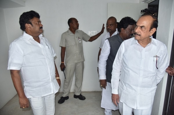 Talasani Srinivas Yadav, Hon'ble Minister for Animal Husbandry and Mohd. Mahmood Ali, Hon'ble Minister for Home are seen inspecting the 2 BHK houses with various departmental officers at Jiaguda Kamela in Jiaguda Division, Karwan Constituency today.