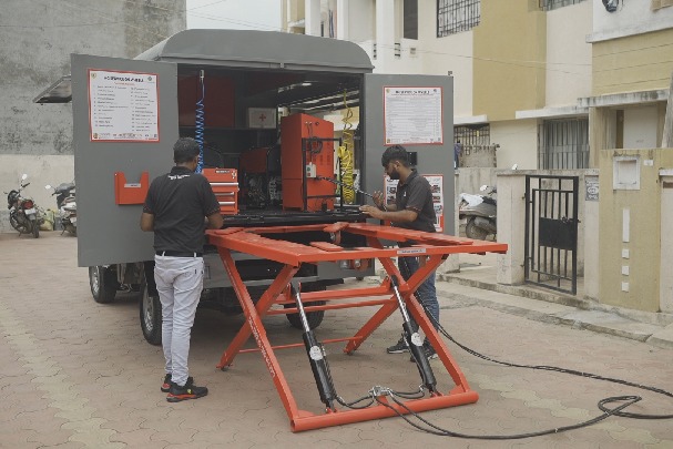 The Service on Wheels initiative will be operationalized through a mobile workshop. The mobile workshop comes equipped with a hydraulic scissor lift attached to a hydraulic power pack, an air compressor with a washing pump and additional provision for dry wash, a digital oil dispenser, a waste oil collection tank, and a pneumatic line with a filter-regulator-lubricator (FRL) unit. In addition to this, there is provision for a fully stacked spare parts rack and illumination through an LED lamp. The workshop vehicle also has a wheel balancer with slider, an electric control box, and a first-aid box.