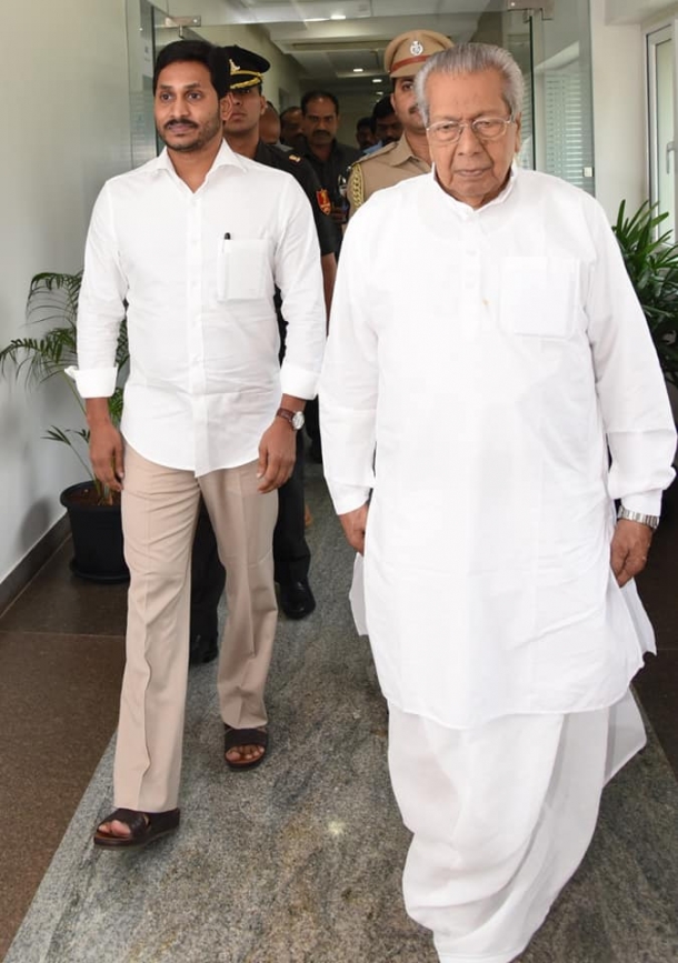 రాష్ట్ర ప్రభుత్వం నవరత్నాల పేరిట ప్రతిష్టాత్మకంగా అమలు చేస్తున్న సంక్షేమ కార్యక్రమాలను గురించి ముఖ్యమంత్రి జగన్ మోహన్ రెడ్డి వివరించారు. ముఖ్యమంత్రి దంపతుల గౌరవార్దం గవర్నర్ దంపతులు ప్రత్యేకంగా రాజ్ భవన్ లో భోజన ఏర్పాట్లు చేయించారు. తొలుత రాజ్ భవన్ లో గవర్నర్ కార్యదర్శి ముఖేష్ కుమార్ మీనా, సంయుక్త కార్యదర్శి అర్జునరావు, ఇతర అధికారులు ముఖ్యమంత్రి జగన్ మోహన్ రెడ్డిని స్వాగతించారు. గవర్నర్ శాలువా, మెమెంటోలతో సీఎంను గౌరవించగా, ముఖ్యమంత్రి సైతం అదే తీరుగా గవర్నర్ ను సత్కరించారు. సీఎం వెంబడి ముఖ్యమంత్రి కార్యక్రమాల కమిటీ ఛైర్మన్ తలశిల రఘురాం, ముఖ్యమంత్రి కార్యదర్శి ధనుంజయ రెడ్డి, ఇతర అధికారులు ఉన్నారు.
