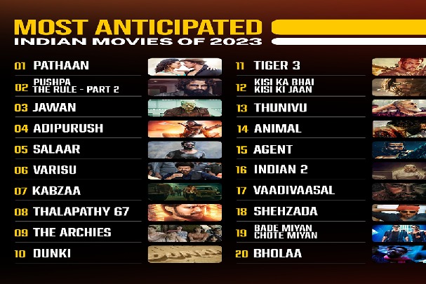 2022లో ప్రపంచవ్యాప్తంగా IMDb యొక్క 200 మిలియన్ల కంటే ఎక్కువ నెలవారీ సందర్శకుల వాస్తవ పేజీ వీక్షణల ద్వారా నిర్ణయించబడిన ప్రకారం 2023లో భారతదేశంలో విడుదల చేయాలనుకున్న భారతీయ సినిమాలలో, IMDb వినియోగదారులలో ఈ 20 స్థిరంగా అత్యంత ప్రజాదరణ పొందాయి. అలర్ట్లు అందుబాటులోకి వచ్చినప్పుడు వాటిని పొందడానికి, IMDb వినియోగదారులు తమ IMDb వాచ్లిస్ట్లో వీటిని మరియు ఇతర శీర్షికలను జోడించగలరు.